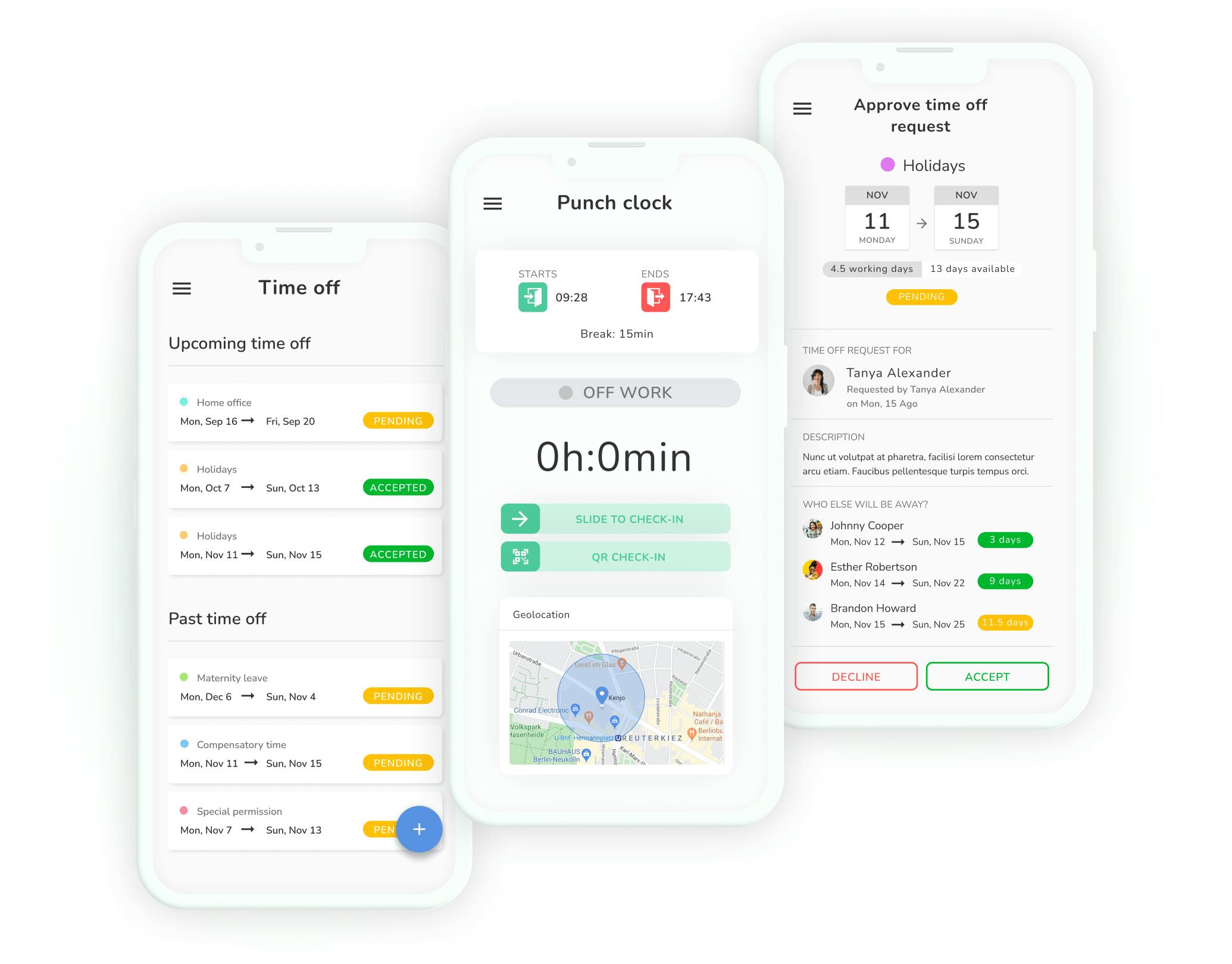 Allow your employees to clock in from their mobile phones, computers or and sync their watches to the Kenjo app. Use our advanced attendance, absence and overtime reports.