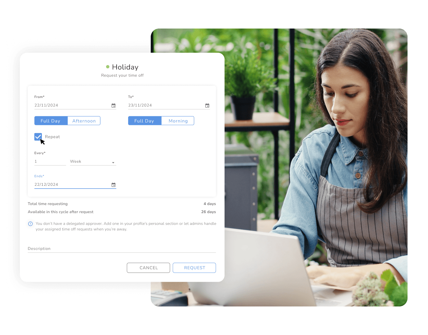 Easily specify the type of time off, date, and duration, allowing multiple requests in one simple step, including sick leave, holidays, parental leave, work-from-home, and half days.