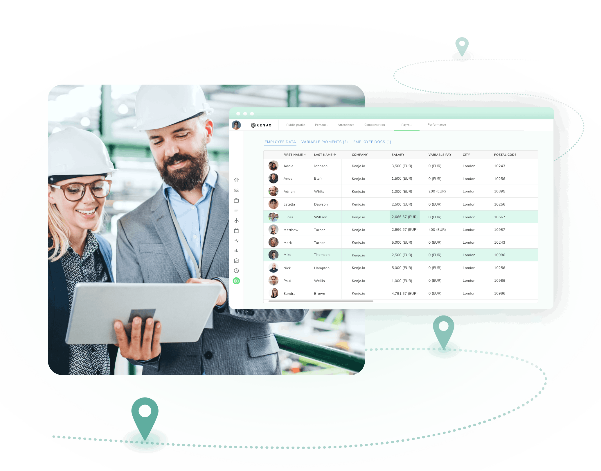 Let your employees track their working and break times from their cell phones or computers, or synchronize your own time tracking terminal with Kenjo. Create a geographic time tracking for employees whose workplace is not located at the headquarters.