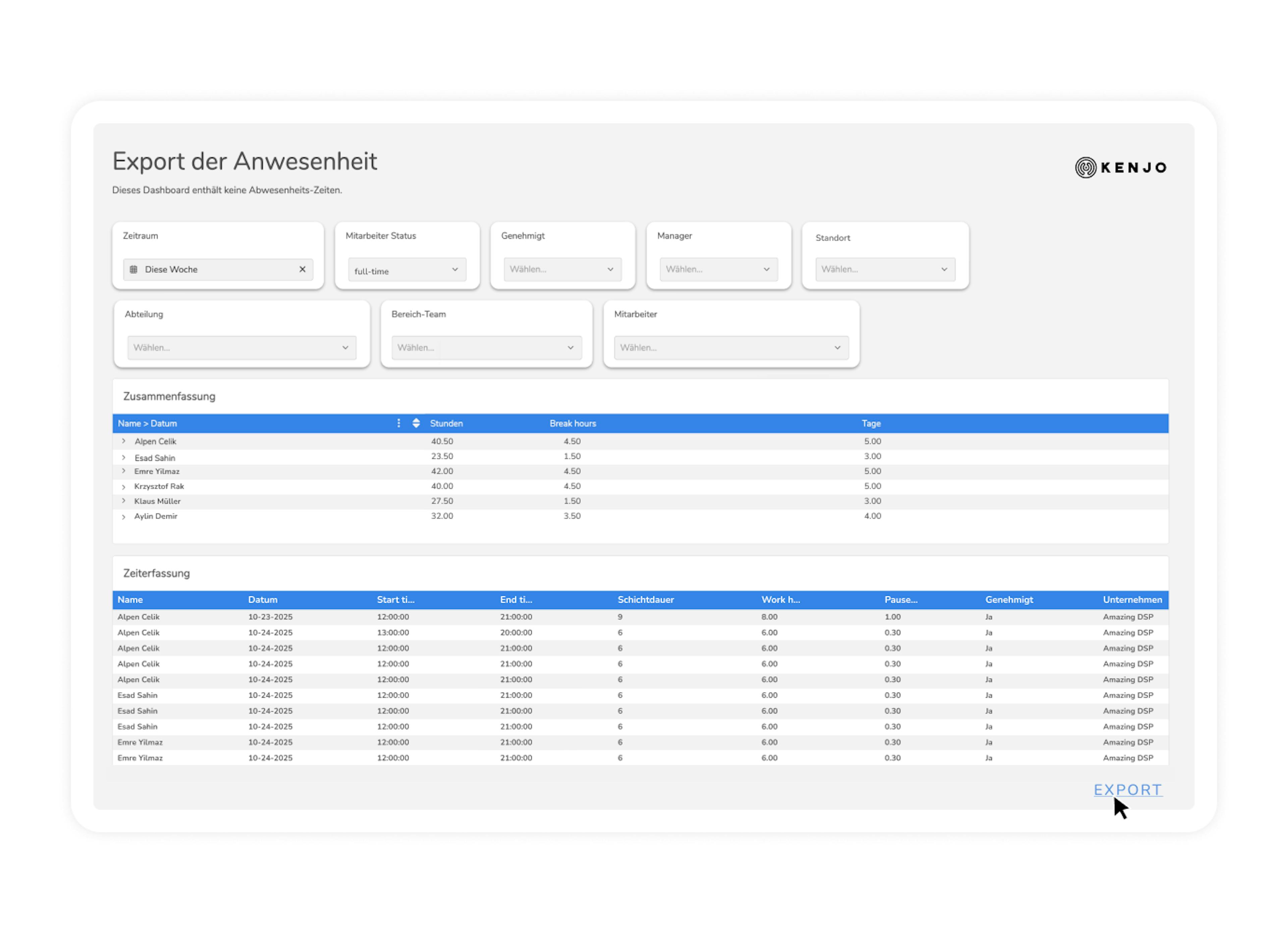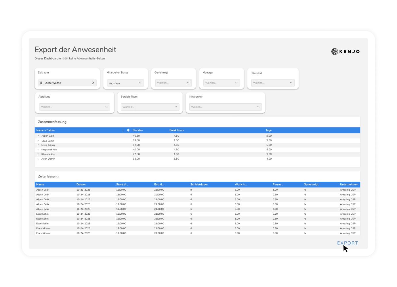 Deine Daten bleiben in der EU – und sind DSGVO-konform. Kenjo ist DSGVO-konform, auf EU-Servern gehostet und wird von einem Unternehmen mit Sitz in der EU entwickelt.