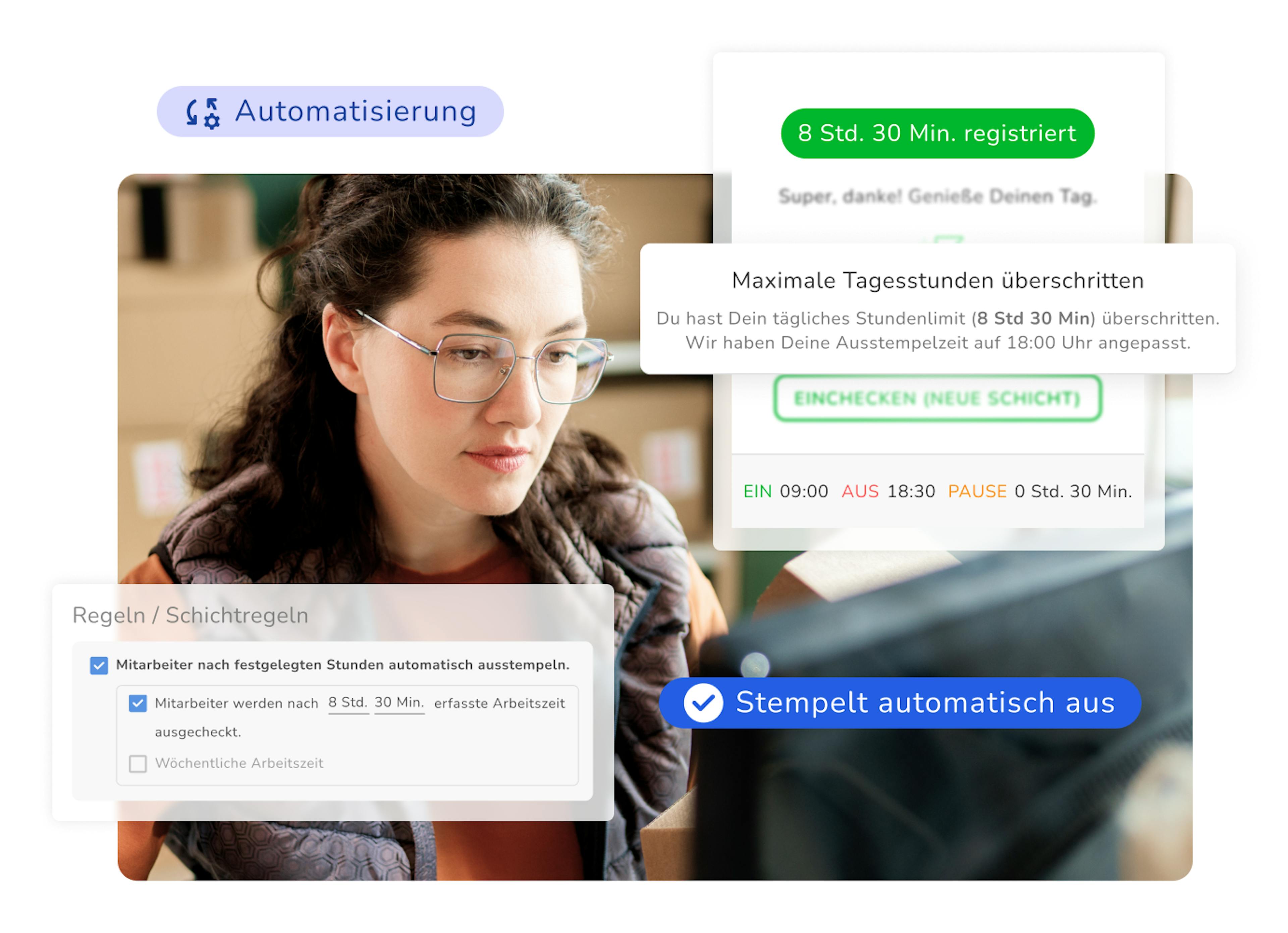 Bleib in Kontrolle, auch wenn Du nicht vor Ort bist. Mit erweiterten Funktionen wie Geolokalisierung-Check-in-Sperre, automatischem Pausenabzug und Limitierung von Früh-Check-ins.