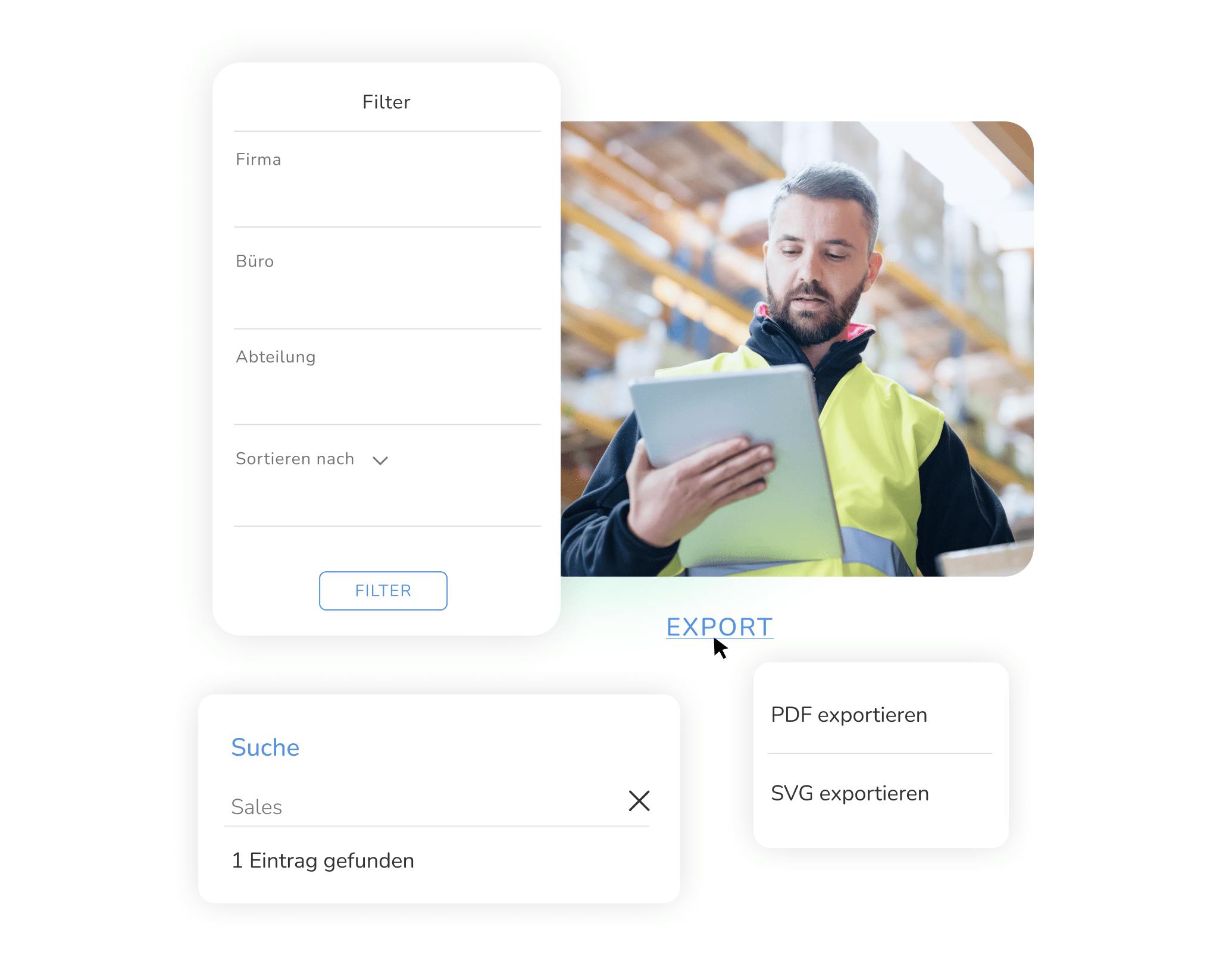 Gezielte Filtermöglichkeiten – Filtere nach Unternehmen, Büro, Abteilung oder Team, um schnell die gewünschten Daten zu finden.