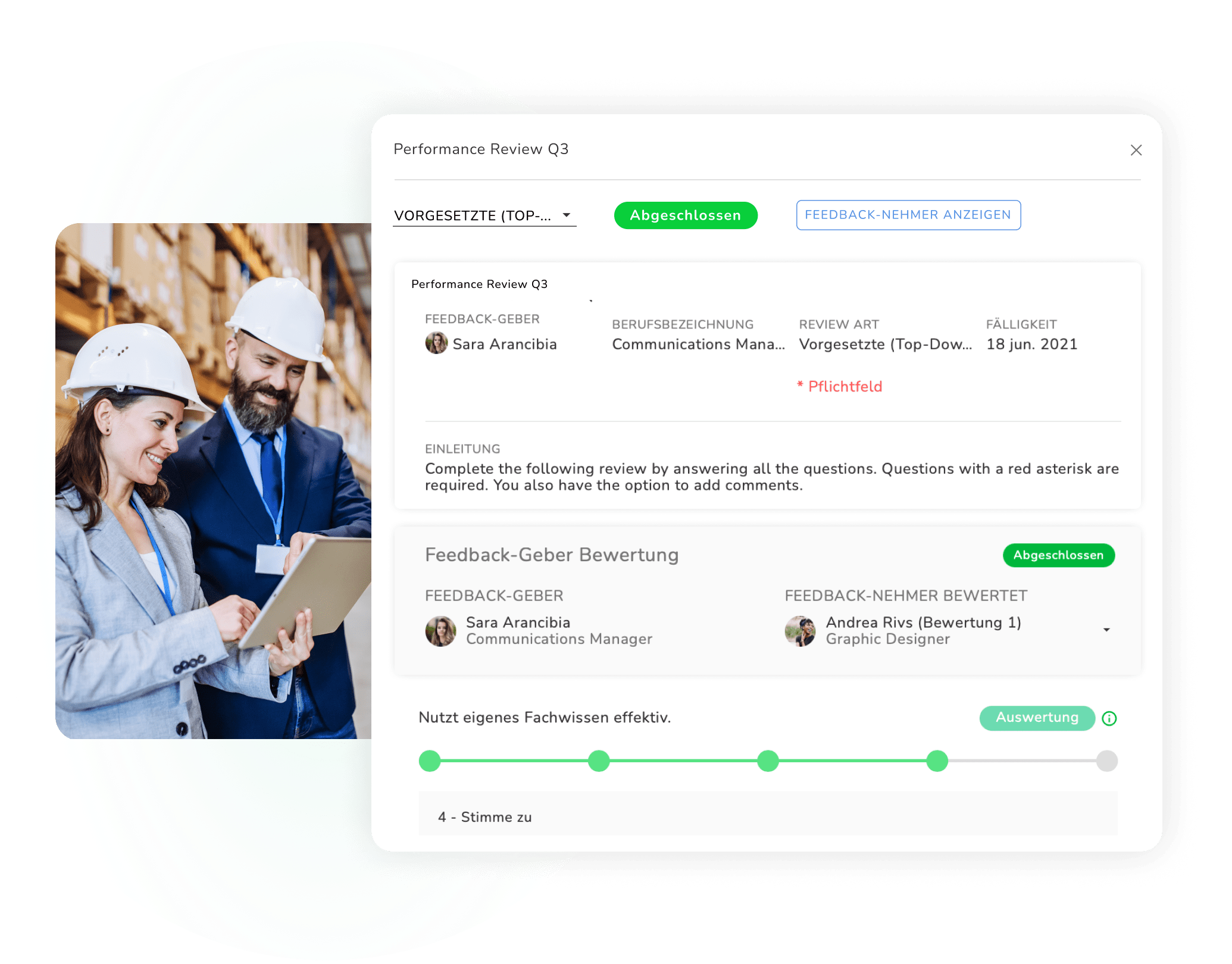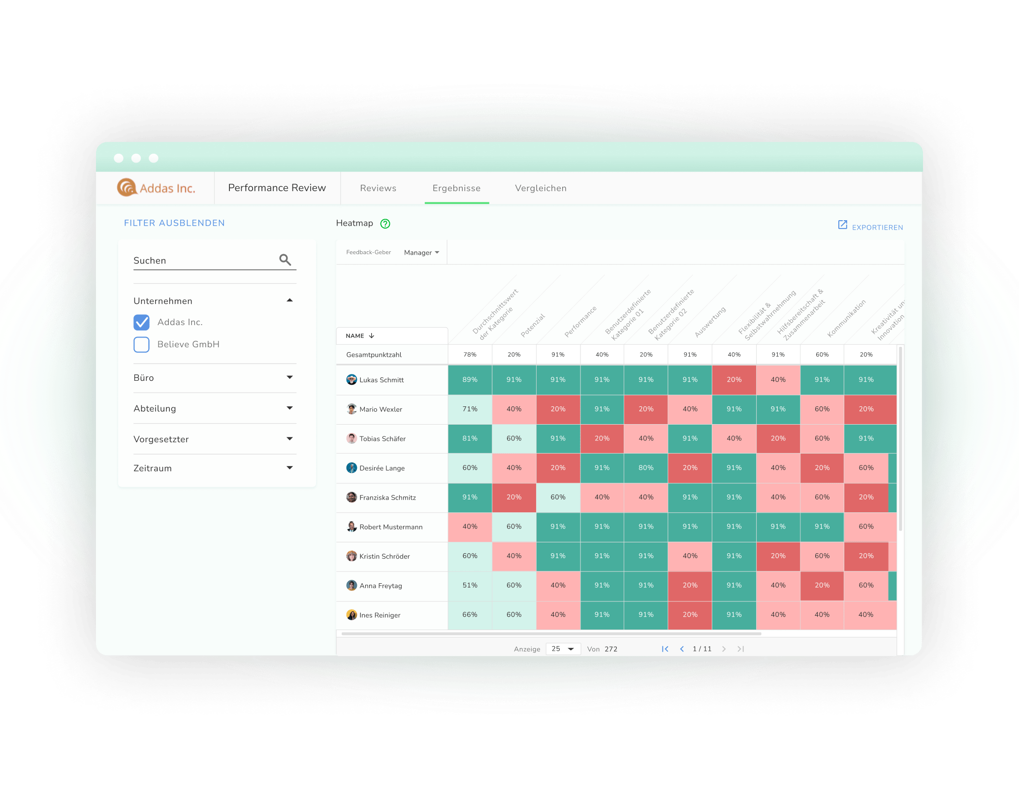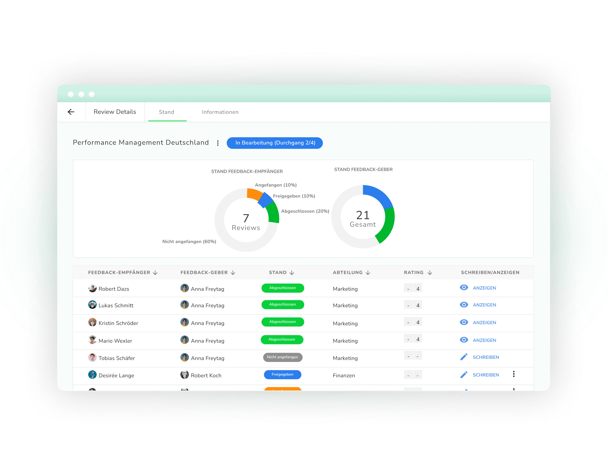 Vielseitige Ansichten: Betrachte Ergebnisse und Vergleiche für alle Mitarbeiter und individuelle Reviews.