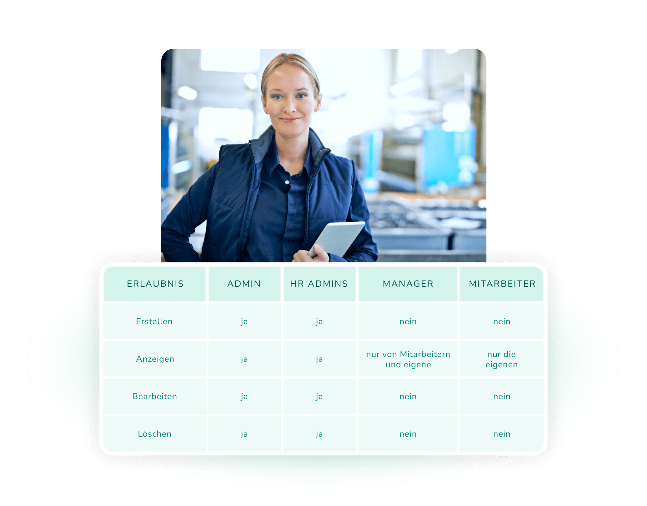 Managementrollen: Standardberechtigungen für Admins, HR-Admins und Manager.