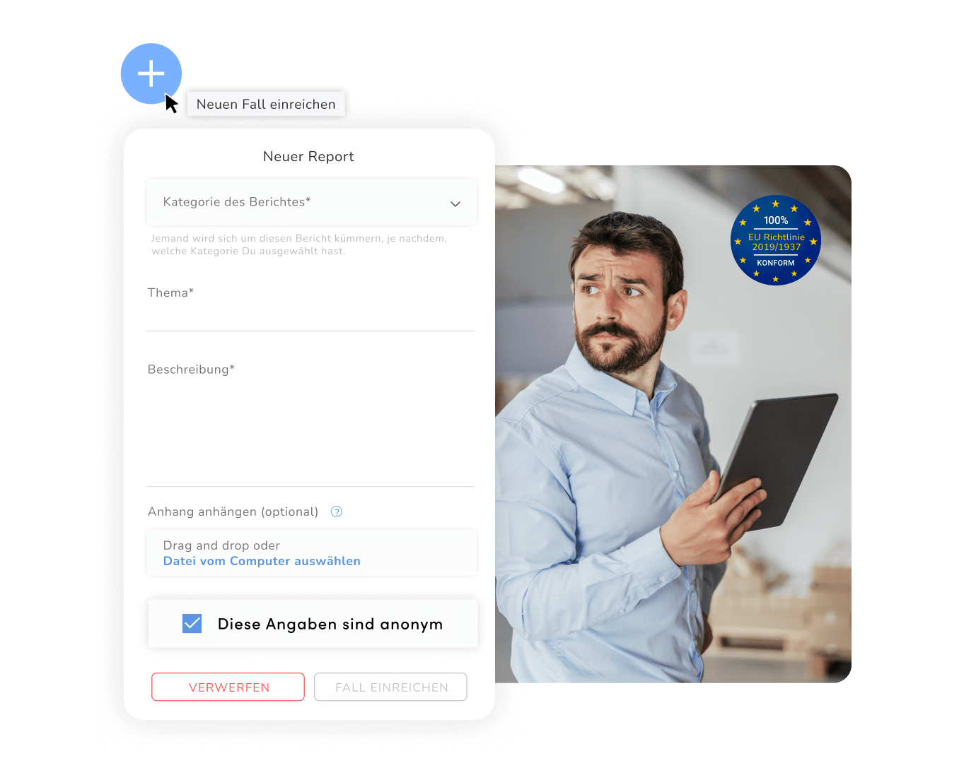 Das Einreichen einer Beschwerde ist mit einem einfachen Klick möglich. Benachrichtigungen werden automatisch an den zuständigen Sachbearbeiter gesendet. Darüber hinaus ermöglicht unser sicheres und vertrauliches Nachrichtensystem eine Kommunikation zwischen Sachbearbeitern und Hinweisgebern.