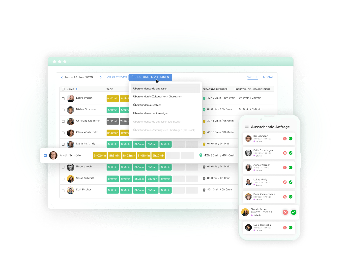 Plane die Urlaubs- und Abwesenheitszeiten Deiner Mitarbeiter DSGVO-konform und erhalte einen schnellen Überblick über ausstehende Genehmigungsanträge und Überstunden.