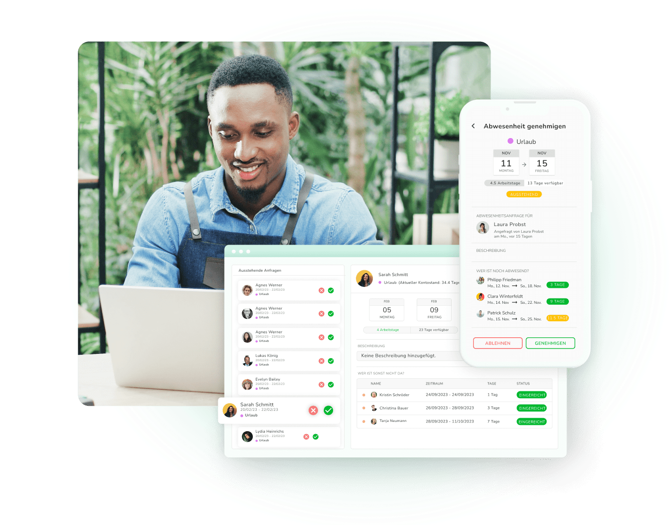 Behalte mit unserem Abwesenheitsmanagement die unterschiedlichen Abwesenheiten wie Urlaube, Krankheitstage und Homeoffice-Zeiten deiner Belegschaft im Blick - Unabhängig vom Endgerät.