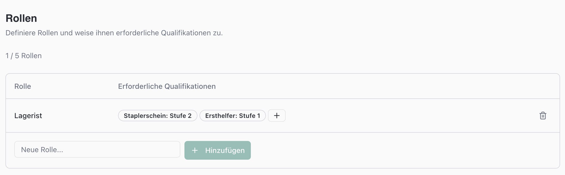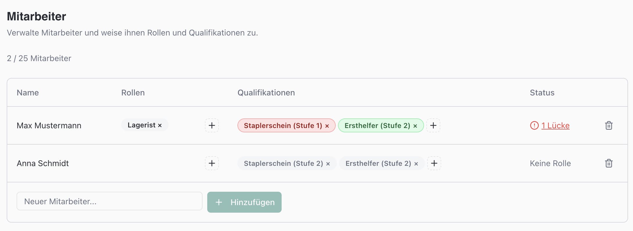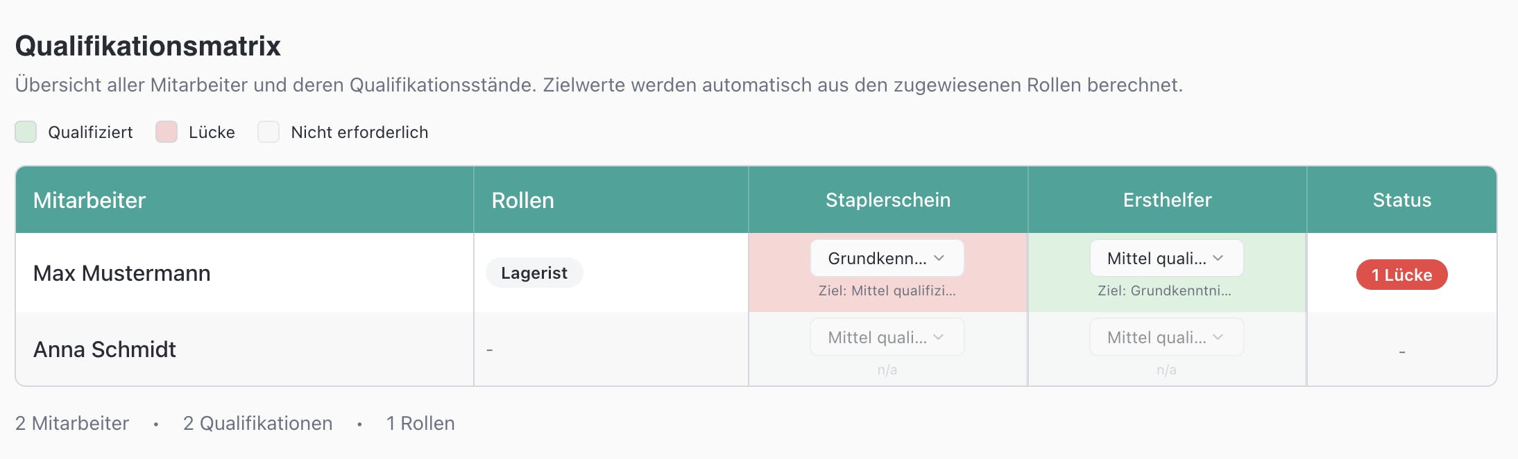Erstelle in wenigen Minuten eine übersichtliche Qualifikationsmatrix für Dein Team. Rollen anlegen, Qualifikationen definieren, Anforderungen festlegen und Qualifikationslücken sofort erkennen – ohne Excel, ohne Anmeldung.