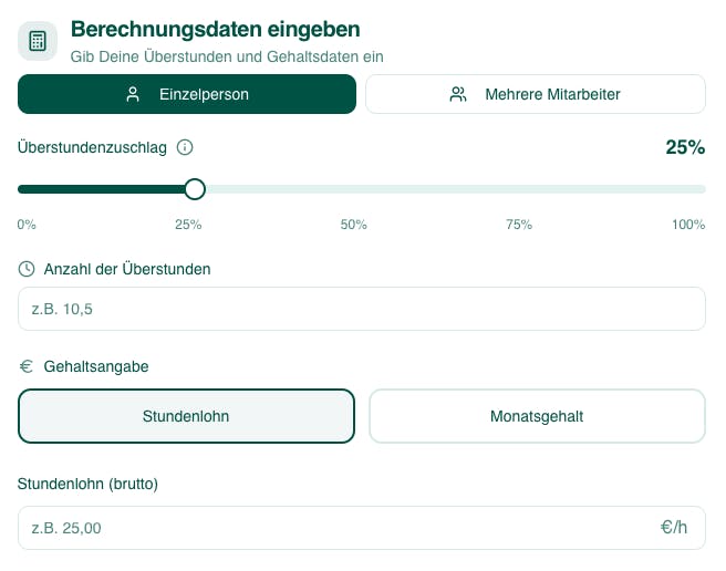 Der Auszahlung Überstunden Rechner zeigt Dir, welchen Bruttobetrag die geleisteten Überstunden bei Auszahlung haben können. Er dient als schnelle Orientierung und ersetzt keine individuelle Lohn- oder Vertragsprüfung.