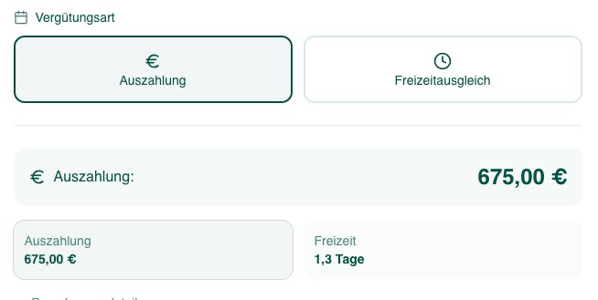 Aus diesen Angaben wird zunächst der Brutto-Stundenlohn ermittelt. Anschließend kannst Du zwischen Auszahlung und Freizeitausgleich wechseln, um entweder den Geldbetrag oder die entsprechende Freizeit zu berechnen.