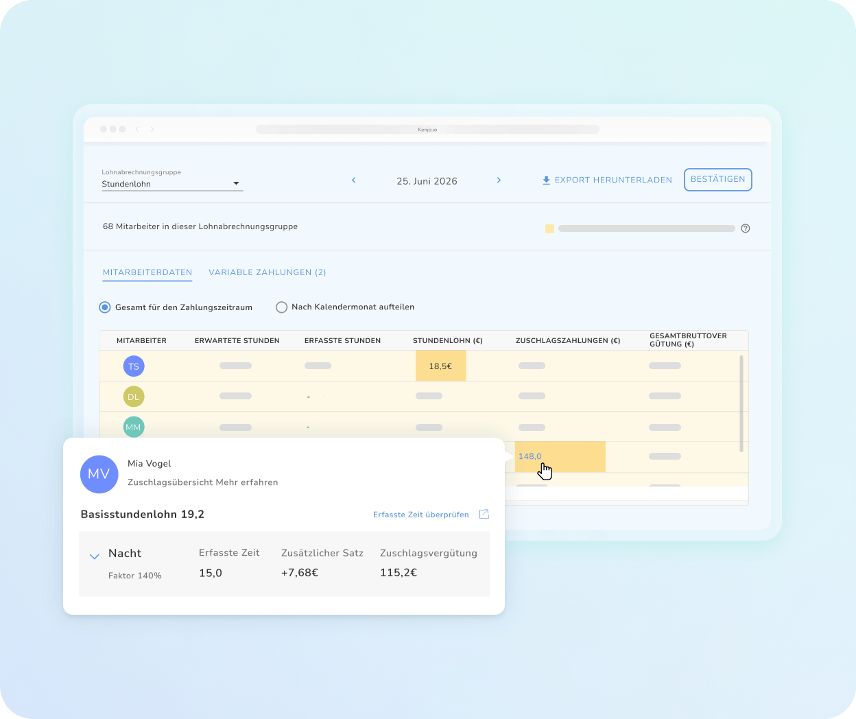 Erledige die Abrechnung auf Basis der Zeiterfassung in nur wenigen Klicks. Vermeide manuelle Tipparbeit und Rechenfehler, indem Du Stunden und Zuschläge automatisch mit Deinem Lohnsystem synchronisierst.