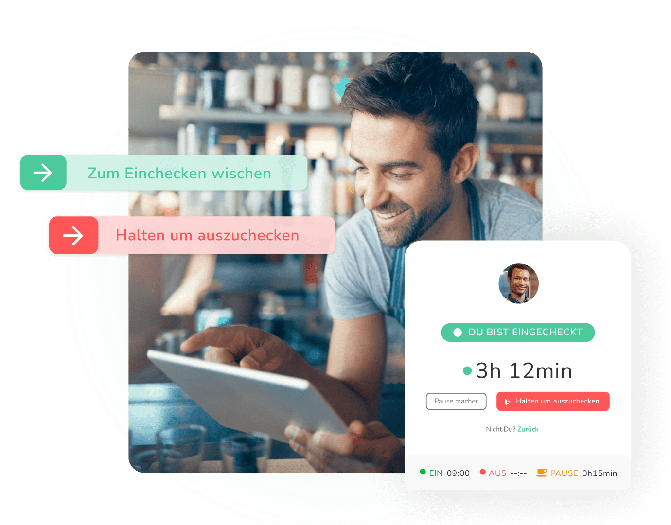 One-Click-Zeiterfassung aktivieren: Dein Mitarbeiter kann mit einem Klick auf Einchecken die Schicht beginnen, über Auschecken beenden, mehrere Schichten und Pausen erfassen.