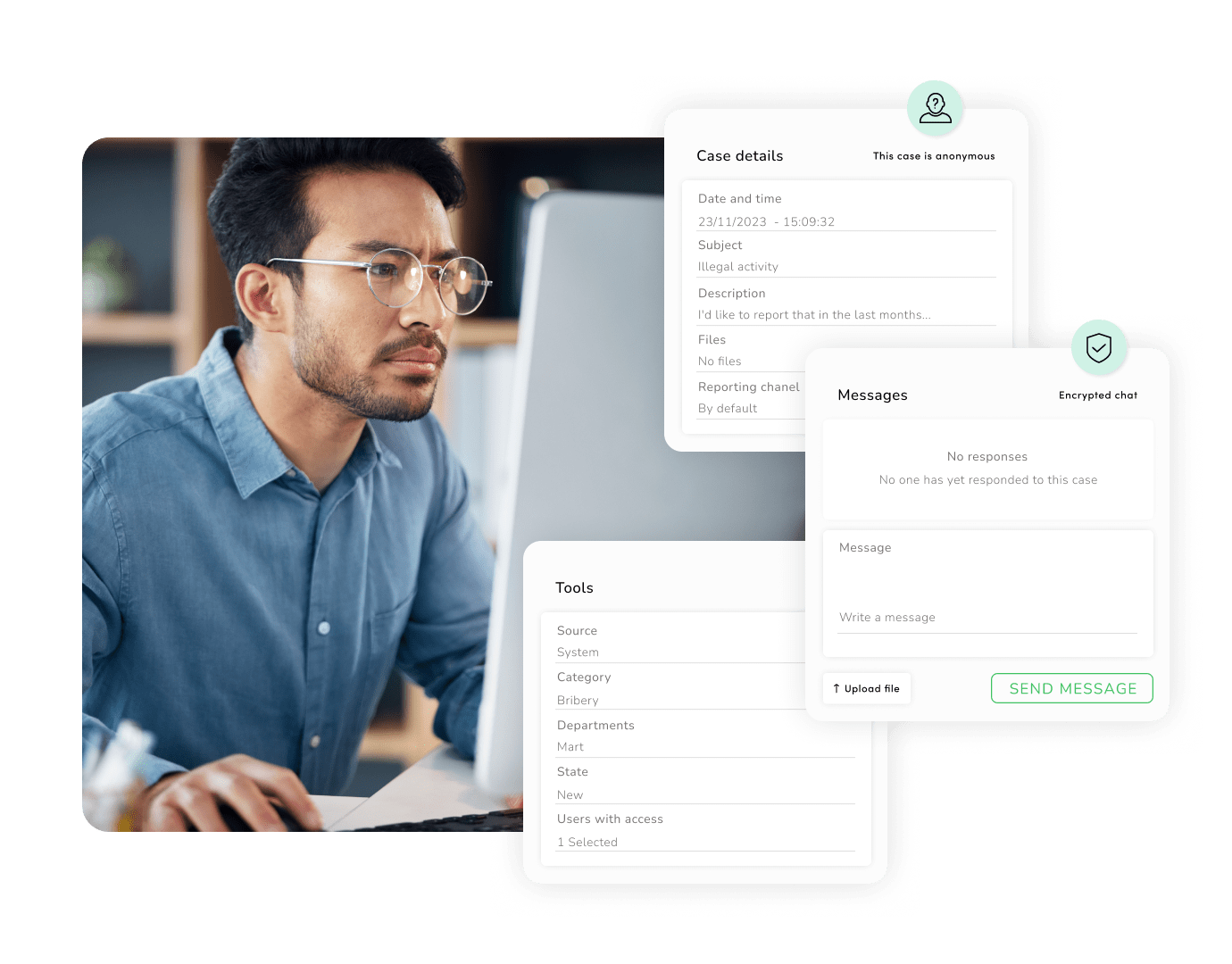 Filing a complaint is possible with just one click. Notifications are automatically sent to the appropriate caseworker via email and app, and a secure messaging system enables confidential communication between caseworkers and whistleblowers.