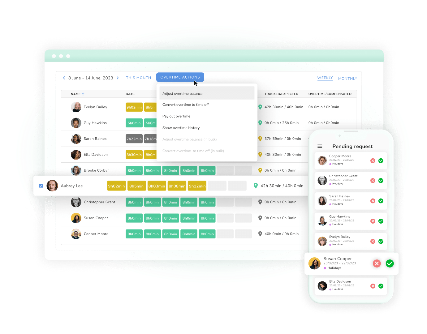 Timesheets can be easily approved from any device. Managers and admins can approve timesheets with one click. Control over overtime through set time limits.